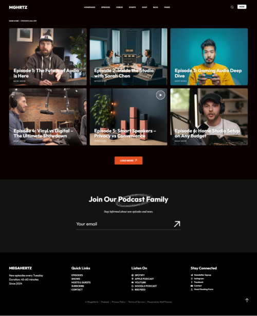Craft episodic content with style. MegaHertz gives you flexible layouts, audio/video embeds, and intuitive navigation so your audience can follow your show effortlessly.